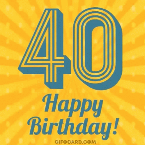 A vibrant animated card wishing a happy 40th birthday, featuring the number 40 in blue on a yellow background.