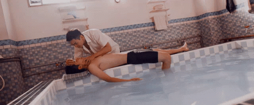 An intense scene from '49days With A Merman' where one man performs mouth-to-mouth resuscitation on another in a pool.