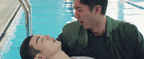 Two men from '49days With A Merman' share an intimate moment in a swimming pool.