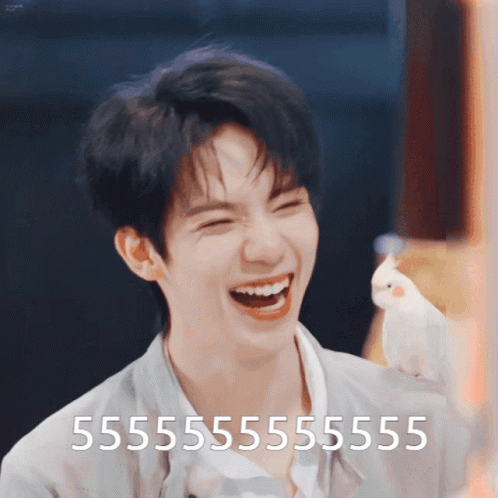Luoyizhou laughs heartily with a white cockatiel perched on his shoulder, accompanied by "555" text.