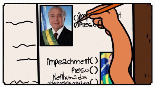 5Alguma Coisa's animated commentary on Brazilian politics, featuring Michel Temer and Jair Bolsonaro, and a stressed cartoon character.