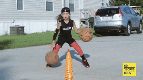 Young girl showcases impressive basketball dribbling skills with two balls, training in a driveway.