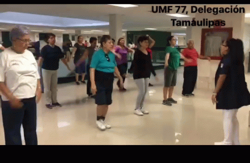 Group of people exercising at UMF 77, Delegación Tamaulipas, led by an instructor.