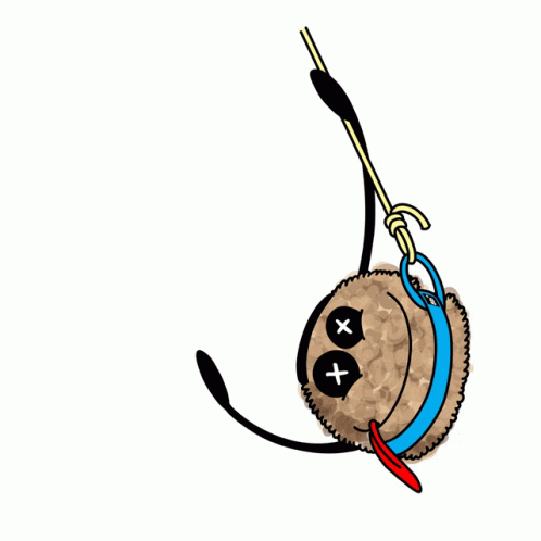 An 8bplus Eatmorechalk monster chalkbag with X eyes and a red tongue hangs from a rope, swinging gently.