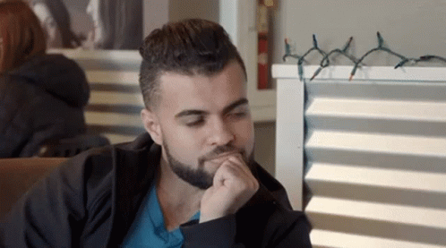 Mohamed Abdelhamed from 90 Day Fiance blinks and looks unimpressed while sitting in a restaurant.