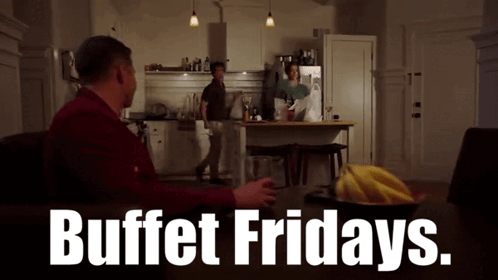 Kenneth Choi as Howard Han from 911 Show sitting at a table with 'Buffet Fridays' text.