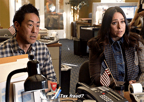Jennifer Love Hewitt as Maddie Buckley in 911, discussing tax fraud with a colleague at their office desk.
