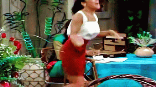 Whitley Gilbert (Jasmine Guy) from A Different World skips excitedly in a kitchen set.
