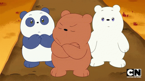 Grizzly, Panda, and Ice Bear from We Bare Bears look frustrated, saying 'We are just trying to help you!'