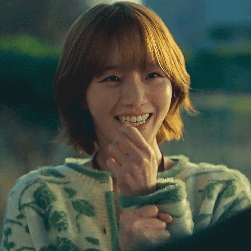 Han Haena (Park Gyu-young) from A Good Day To Be A Dog smiles brightly, covering her mouth in a cozy sweater.