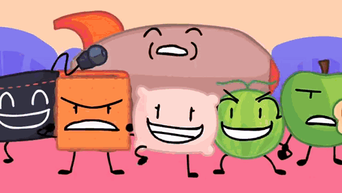 a group of cartoon characters are standing next to each other and one of them has a smiley face on it