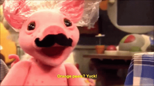 A pink puppet pig from A La Ferme De Zenon, wearing a chef's hat, reacts with disgust to orange peels.
