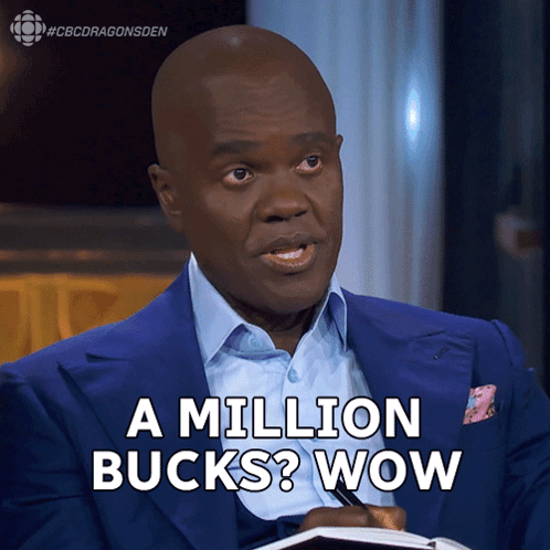 Wes Hall's surprised reaction to a million-dollar offer on CBC Dragons' Den, exclaiming 'A million bucks? Wow!'
