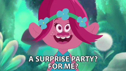 Poppy from Trolls reacts with excited surprise to the idea of a party being thrown just for her.