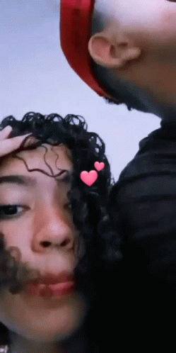 A man kisses a woman on the cheek, with pink heart emojis overlaid on her curly hair.