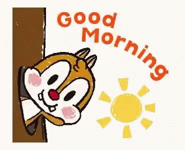 A cute cartoon chipmunk peeks from behind a tree trunk, wishing a good morning with a bright sun.
