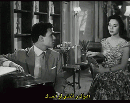 Abdel Halim Hafez and Magda in a scene from 'Banat El Youm' (Modern Girls Movie), with the caption 'I love you and I wish I could forget you'.