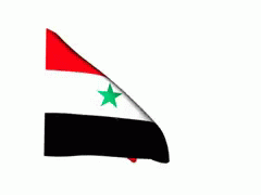 The national flag of Syria, featuring red, white, and black stripes with two green stars, waves proudly.