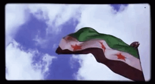 The Syrian Independence Flag, with its green, white, and red stripes and three stars, waves proudly against a cloudy sky.