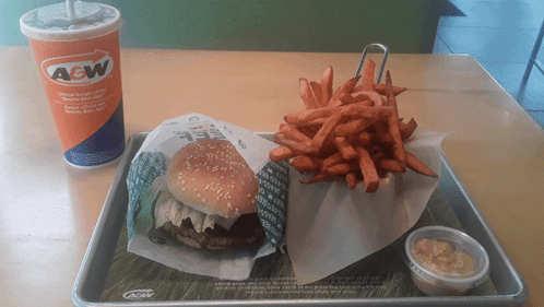A delicious A&W Canada meal featuring a burger, sweet potato fries, and a drink on a tray.