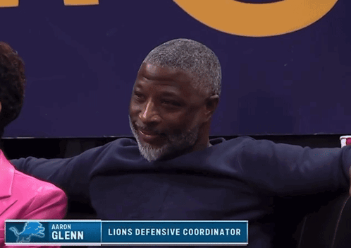 Aaron Glenn, Lions Defensive Coordinator, sits on a couch, nodding and smiling slightly.
