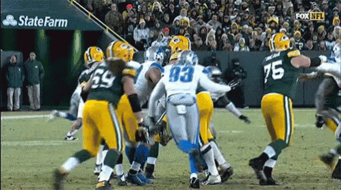 Aaron Rodger of the Green Bay Packers is tackled during an NFL game, then sits up on the field.