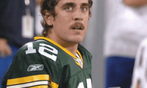 Aaron Rodgers sporting a distinctive mustache while wearing his Green Bay Packers jersey.