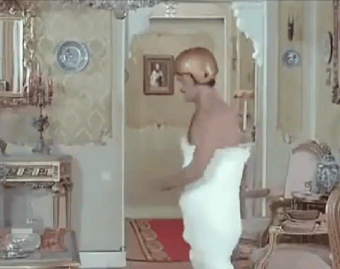 Samir Ghanem, wearing a towel and helmet, dances energetically in an ornate room, likely from the film 'A groom and a bride'.