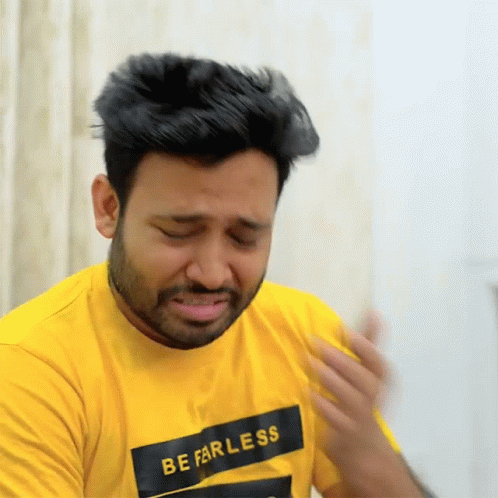 Pankaj Sharma covers his face, then reveals a sad expression, appearing to wipe away tears while wearing a yellow shirt.