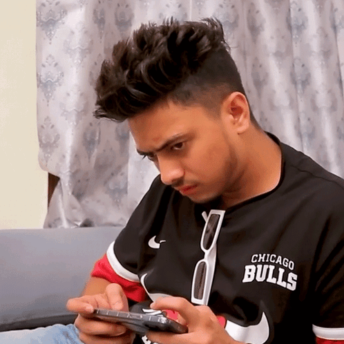 Shivam Yadav, wearing a Chicago Bulls shirt, looks up from his phone with a questioning expression.