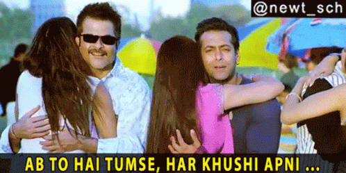 Salman Khan and Anil Kapoor share hugs with women in a scene from 'No Entry', featuring the song 'Ab To Hai Tumse Har Khushi Apni'.