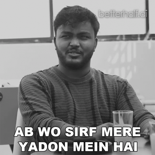 A man sits with a glass of water, reflecting on memories, with the caption 'Ab Wo Sirf Mere Yadon Mein Hai'.