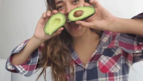 Luisa Moraleida playfully holds avocado halves to her eyes, then shows whole avocados, smiling.