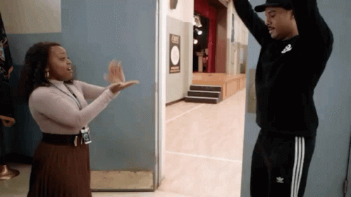 A lively scene from Abbott Elementary featuring two characters interacting and dancing in a school hallway.