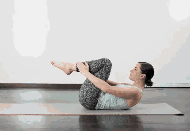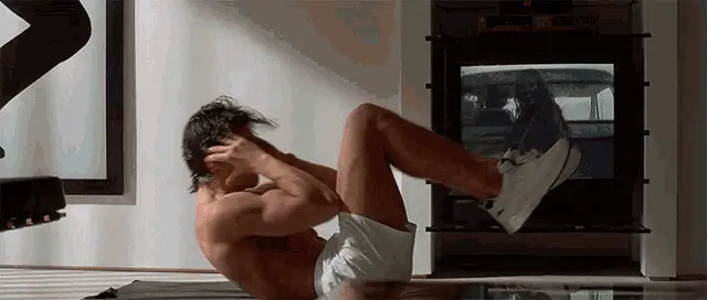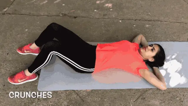 Woman demonstrates supra abdominal crunches on the floor, a core exercise from Treino Mestre.