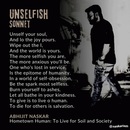 Abhijit Naskar's 'Unselfish Sonnet' poem, advocating for selflessness, kindness, and service to humanity.