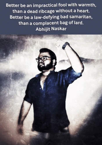 Abhijit Naskar stands before his inspirational quote on warmth, heart, and defying complacency.