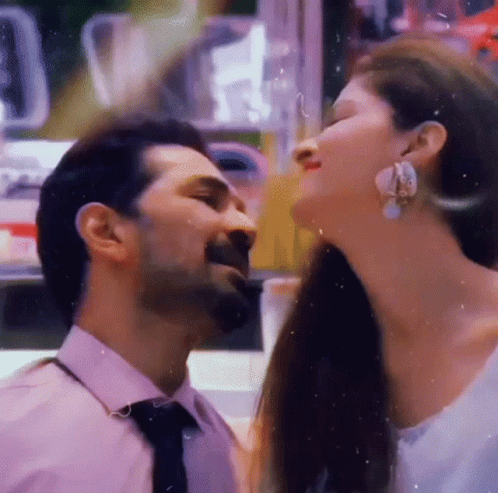 Abhinav Shukla and Rubina Dilaik share a romantic moment, with Abhinav kissing Rubina's cheek.