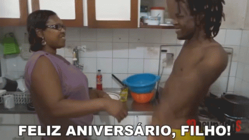 A heartwarming moment as a mother embraces her son for his birthday in the kitchen.