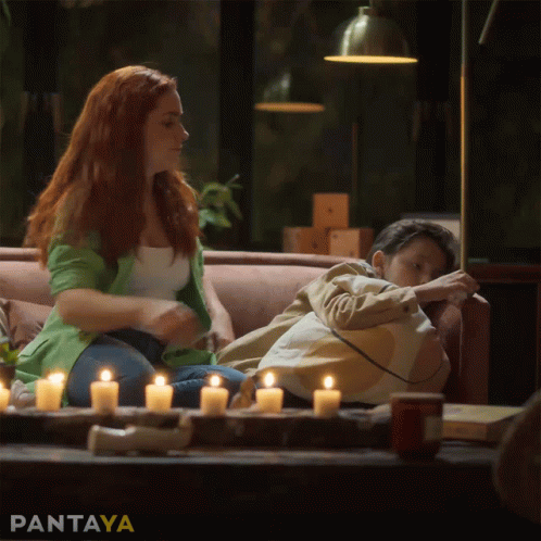 Ariadne Diaz comforts Sam with a warm hug on a cozy couch, surrounded by candles.