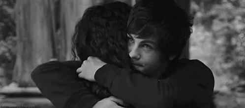 A black and white scene of a young couple embracing each other warmly, showing comfort and affection.
