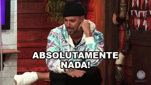 A man in a tie-dye sweatshirt and black hat emphatically says 'Absolutamente Nada!' (Absolutely Nothing!) on A Fazenda.