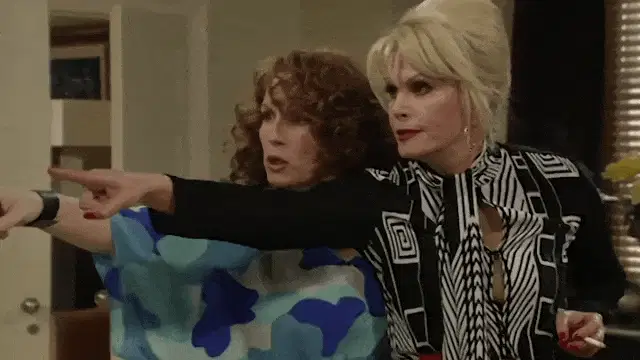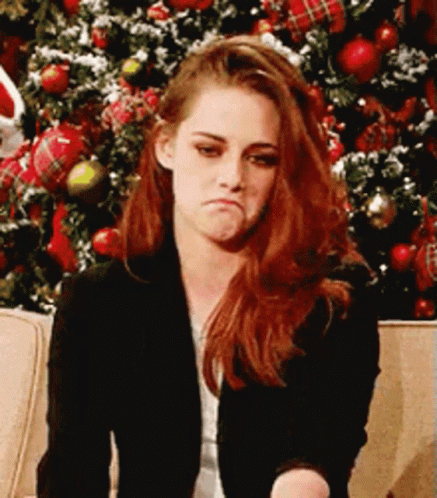 A woman with red hair shrugging and giving a thumbs up in front of a festive Christmas tree.