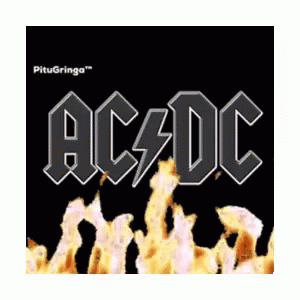 The iconic AC/DC logo with a lightning bolt, set against a backdrop of fiery flames.
