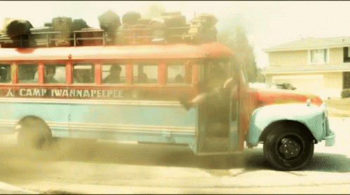 Fred emerges from the Camp Iwannapeepee bus, wearing a crop top and hat, amidst a dusty scene.