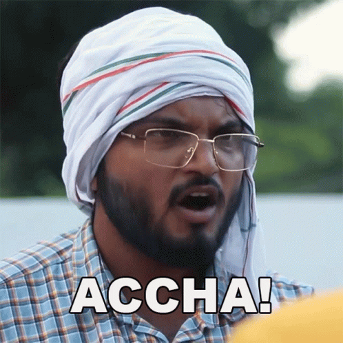 Nitin reacting with an 'Accha!' expression, wearing a turban and glasses.