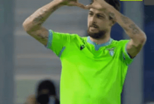Footballer Francesco Acerbi celebrates by making a heart shape with his hands, wearing a neon green Lazio jersey.