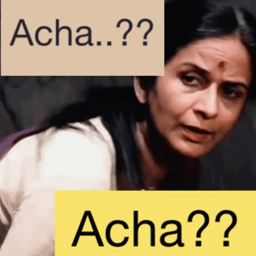 Woman with a bindi reacting with surprise, asking 'Acha??' (Oh, really??).