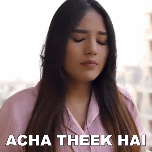 Ahana Goyal in a pink shirt, expressing 'Acha Theek Hai' with a thoughtful expression.