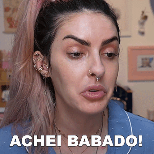Karen Bachini reacts with 'Achei Babado!' in a close-up shot, expressing excitement.